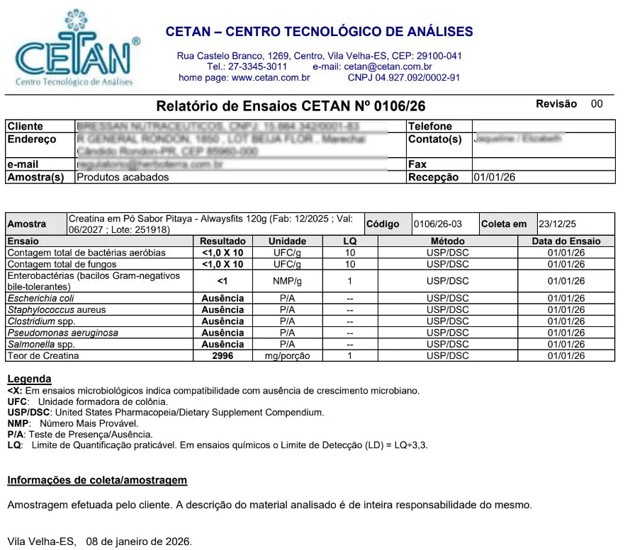 A creatina é um dos suplementos mais estudados e eficazes no mundo, auxiliando no aumento do desempenho físico durante exercícios repetidos de curta duração e alta intensidade, conforme alegação permitida pela Anvisa (IN nº 28/2018).